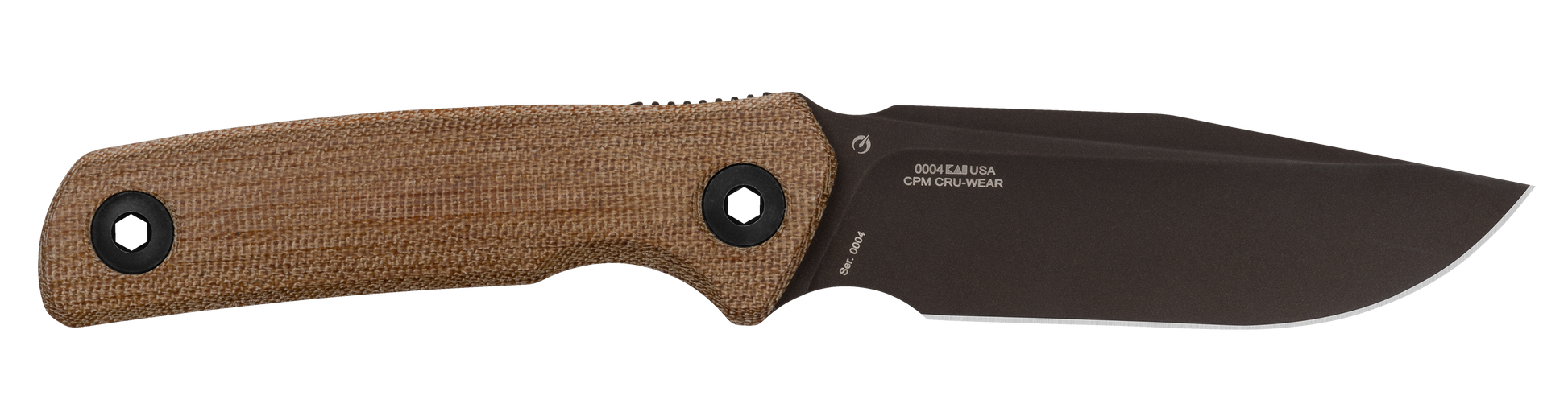 The 0004 workhorse slices and chops through the toughest outdoor and bushcraft challenges. Its clip point blade uses premium Cru-Wear, a tough and easy-to-sharpen steel in the field. Easily control the canvas micarta handle, which is 3D-machined and contoured for your hand. Use an Allen wrench to strip the knife down for easy cleaning and reveal the skeletonized steel tang, ready for paracord wrapping. Carry the 0004 in multiple configurations using a Kansas-made, saddle tan leather sheath, storing the ultimate tool for your journey.