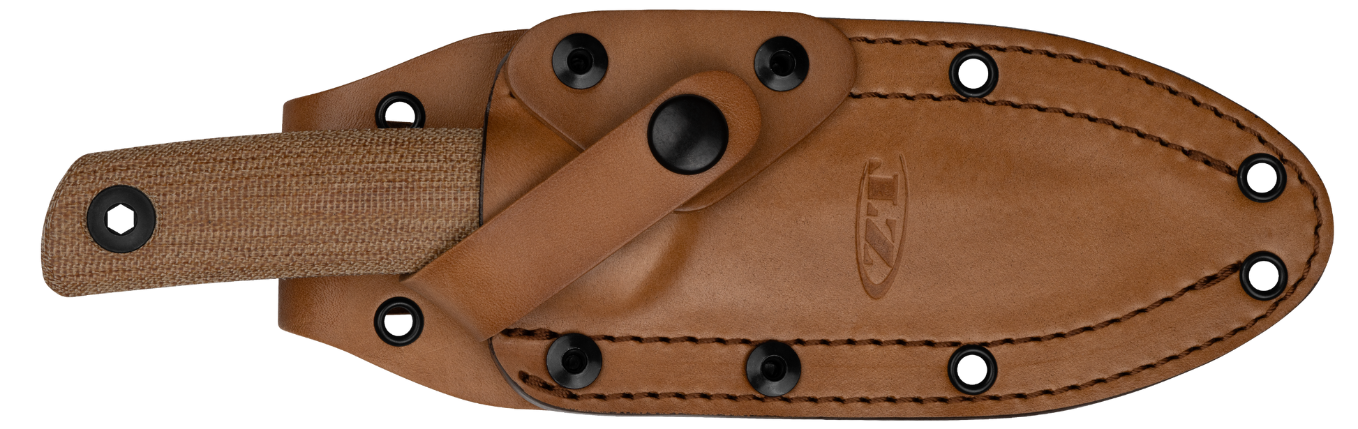 - Full grain, vegetable-tanned saddle tan leather sheath for left/right belt and scout carry; belt loop, Tek-Lok compatibility, and debossed ZT logos on both sides