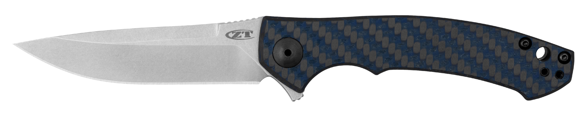 The Zero Tolerance 0450BLUCF, a Dmitry Sinkevich design, is a compact version of the award-winning 0454 folder. It may be a smaller option, but it offers a robust combination of durable, premium-quality materials. The blade steel is stonewashed CPM-MagnaCut for exceptional toughness, wear resistance, and edge retention. The front handle scale is blue carbon fiber, balancing the knife's solid construction with lightweight convenience. The stonewashed titanium back handle offers a secure frame lock.