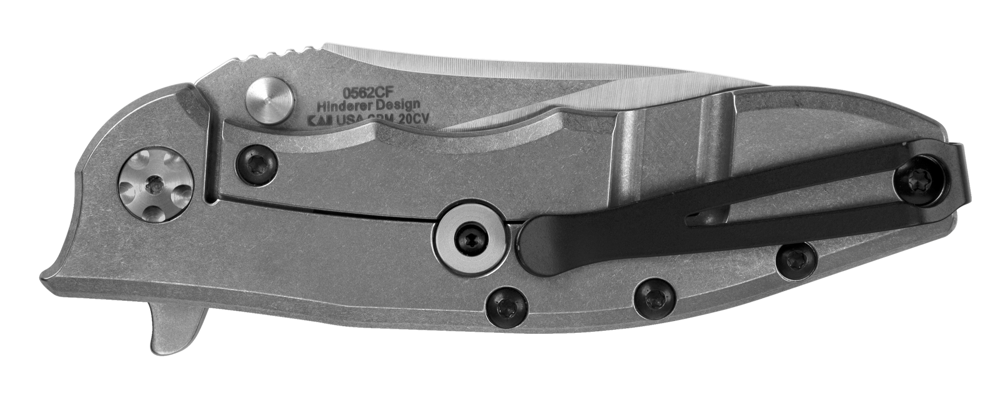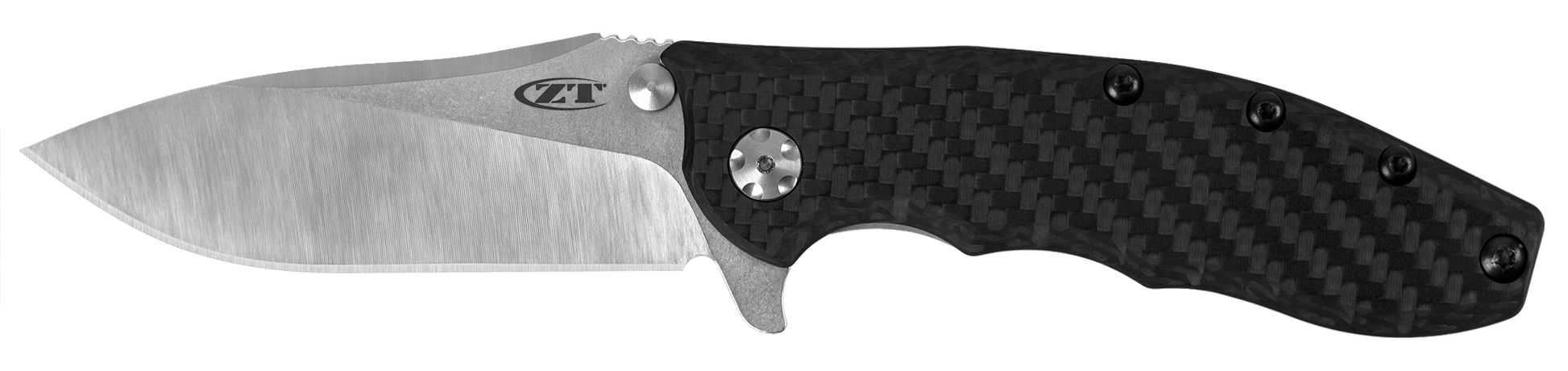 The 0562CF, from ZT and Rick Hinderer is the dressed-up version of the popular 0562. With a carbon fiber front scale and Rick’s "slicer" grind, this top performer is ready to take on your next task. The blade has a sweet slicing edge, but also supports the blade tip to make it excellent for piercing, too. The 0562CF’s handle has a carbon fiber front scale and stonewashed titanium back. For secure lock up during use, ZT uses a frame lock with hardened steel lockbar inserts and lockbar stabilization.