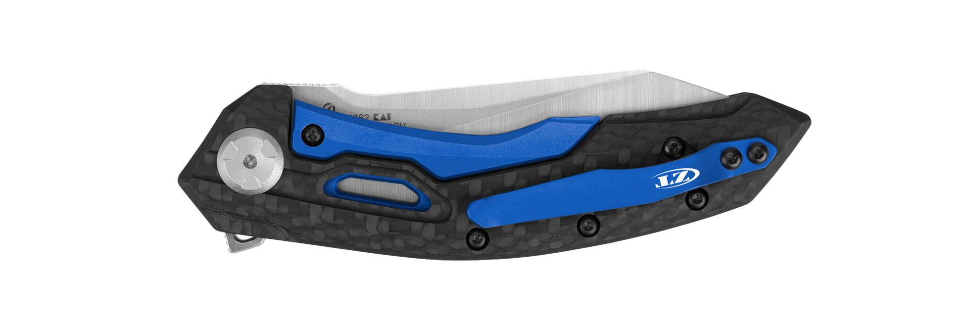 Packed with innovation, the 0762 delivers a top-of-the-line ZT experience. Its reverse tanto blade and carbon fiber handle scales offer the ultimate medium-size ZT carry. Open the 0762 reliably with the ZT Tuned Detent System (TDS™), allowing the blade to deploy even with pressure on the lockbar. The ZT Sub-Frame Lock secures the blade into place without sacrificing the lightweight benefit of carbon fiber. A two-tone CPM 20CV blade is pleasing to the eye and just as useful during work tasks. The 0762 stands out with an array of aesthetic details, including matching blue-anodized hardware and sleek handle windows, creating a ZT showpiece slicer.