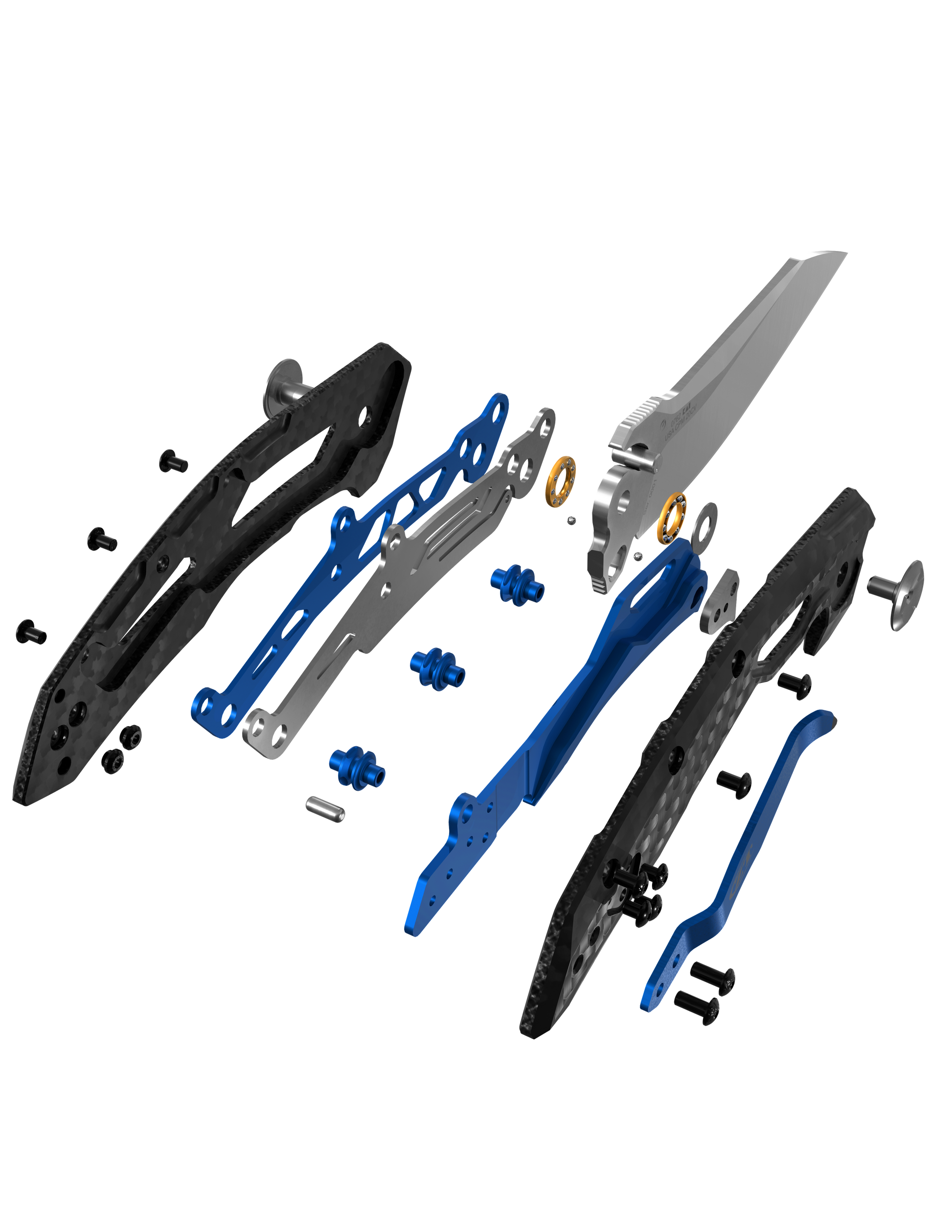 - Matching blue-anodized hardware, Sub-Frame Lock, and reversible titanium pocket clip compliment the black carbon fiber