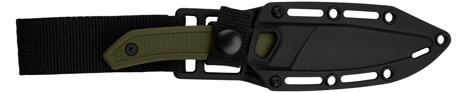 β’ Molded sheath for secure carry; webbing slots, drainage hole,