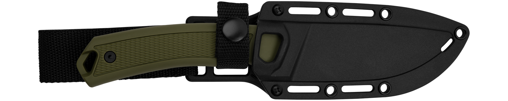 - Molded sheath for secure carry; webbing slots, drainage hole, and removable belt strap