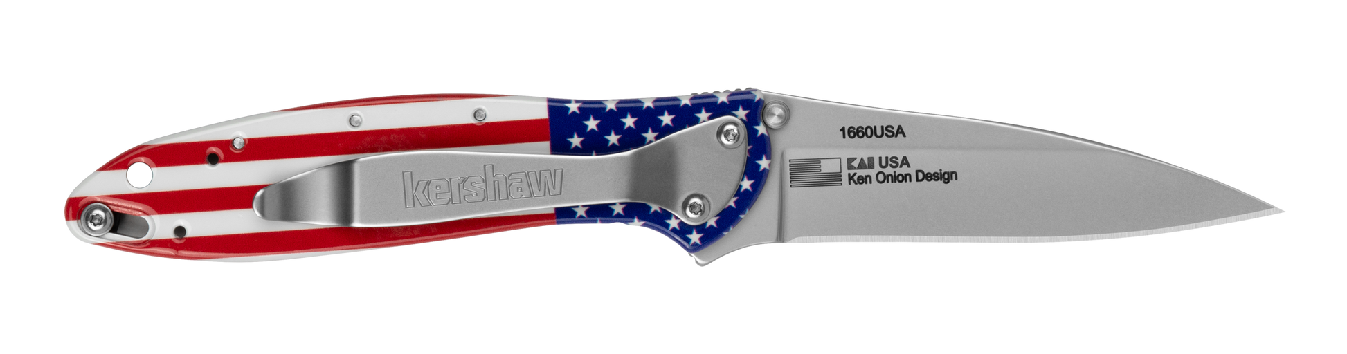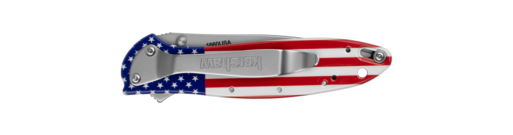Celebrate the American spirit with a proud and patriotic Leek. Manufactured in the USA, this Kershaw displays a custom handle image of the Stars and Stripes. Activate the American folder easily with assisted opening and a flipper. The slim design and sharp blade make it perfect for everyday carry. When closed, slide the tip lock up to safely secure the blade. Carry the red, white, and blue on your next adventure with the Leek – USA Flag.