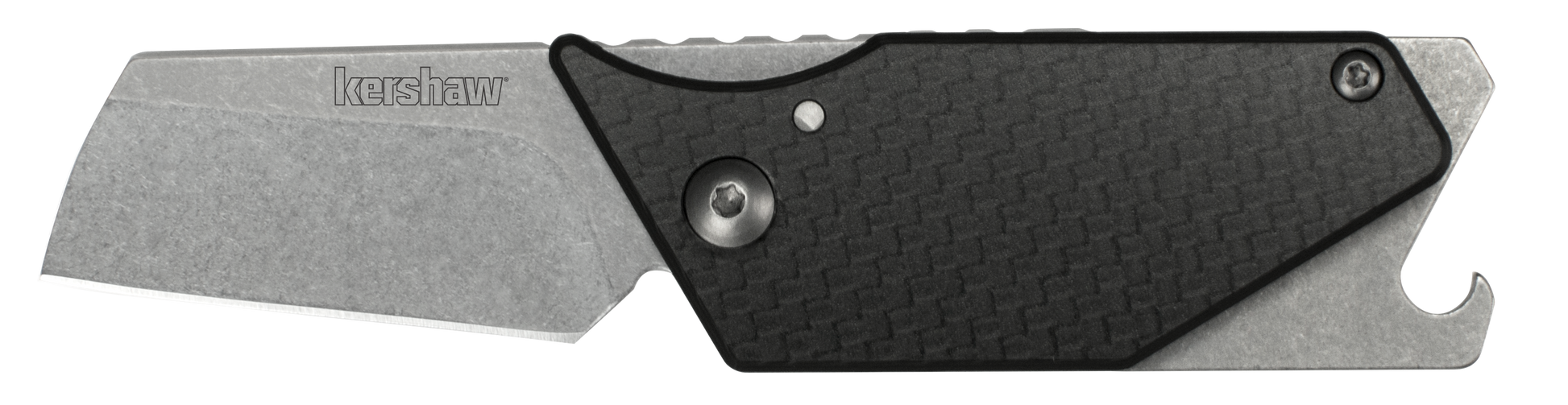 This Pub features an upgraded handle of carbon fiber. Designed by Belarusian custom knifemaker Dmitry Sinkevich, the Kershaw Pub is a unique keychain knife. Closed, you’d never know there was a handy blade inside. To open the blade, just push down on what looks like the key ring attachment—and the modified sheepsfoot blade folds easily out of the handle.
